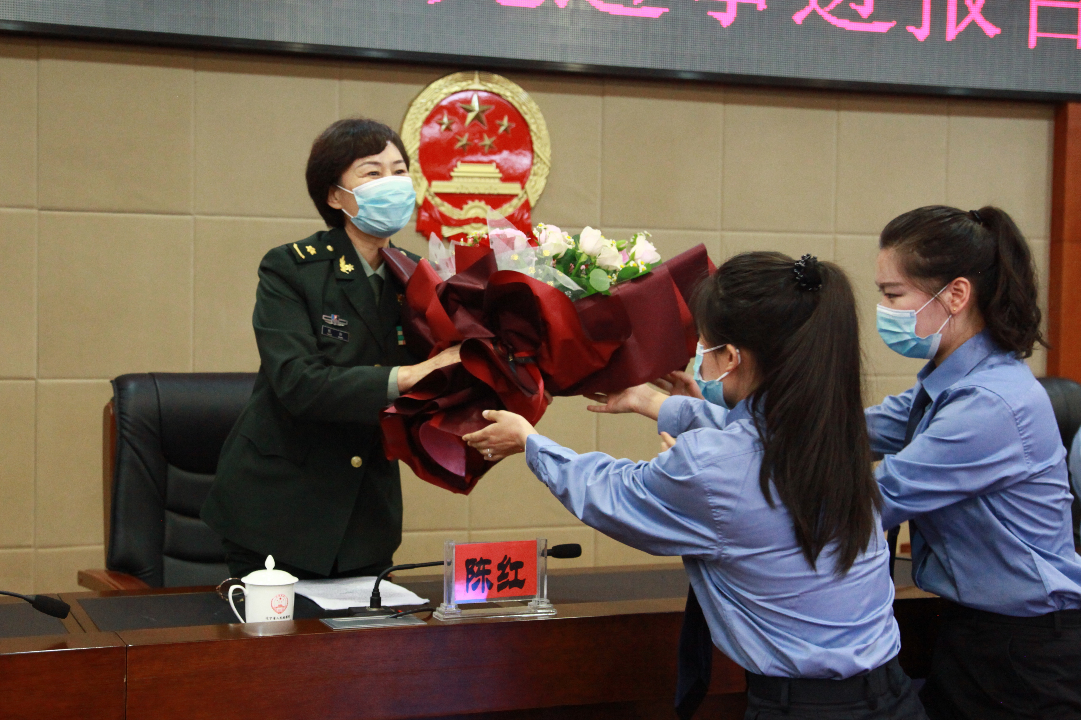 在授课前播放的中央电视台军事频道的专题片中,展现了陈红于2003年请战小汤山抗击“非典”,2008年奔赴汶川抗震救灾,2014年远赴非洲利比里亚抗击“埃博拉”病毒,在此次战“疫”中又再次请缨勇敢逆行的事迹。这位四度请战出征的白衣战士,荣获“全国三八红旗手”称号,被国家七部委表彰为“埃博拉疫情防控先进个人”,多次荣立个人二等功、三等功。功勋卓著的陈红赢得了在场干警的热烈掌声,干警们为她献上了鲜花,以表达沈铁两级院全体干警对这位抗疫英雄的崇高敬意。