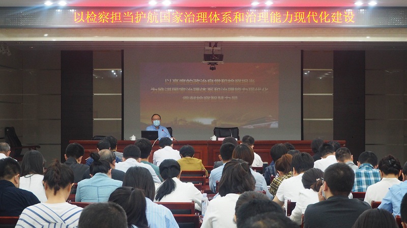张海峰以《以检察担当护航国家治理体系和治理能力现代化建设》为题,从检察视角系统剖析了全会审议通过的《中共中央关于坚持和完善中国特色社会主义制度推进国家治理体系和治理能力现代化若干重大问题的决定》总体目标和重点任务,从“十三个坚持”方面深刻阐述了中国特色社会主义制度和国家治理体系的显著优势,结合检察工作实际深刻解析了“讲政治、顾大局、谋发展、重自强”的检察工作总要求,并对张军检察长提出的“三个同心”理念进行了深入分析和详细解读。