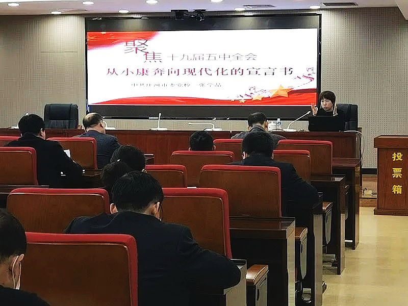 ▲庄河市检察院邀请市委党校教务部主任张学晶讲授十九届五中全会精神