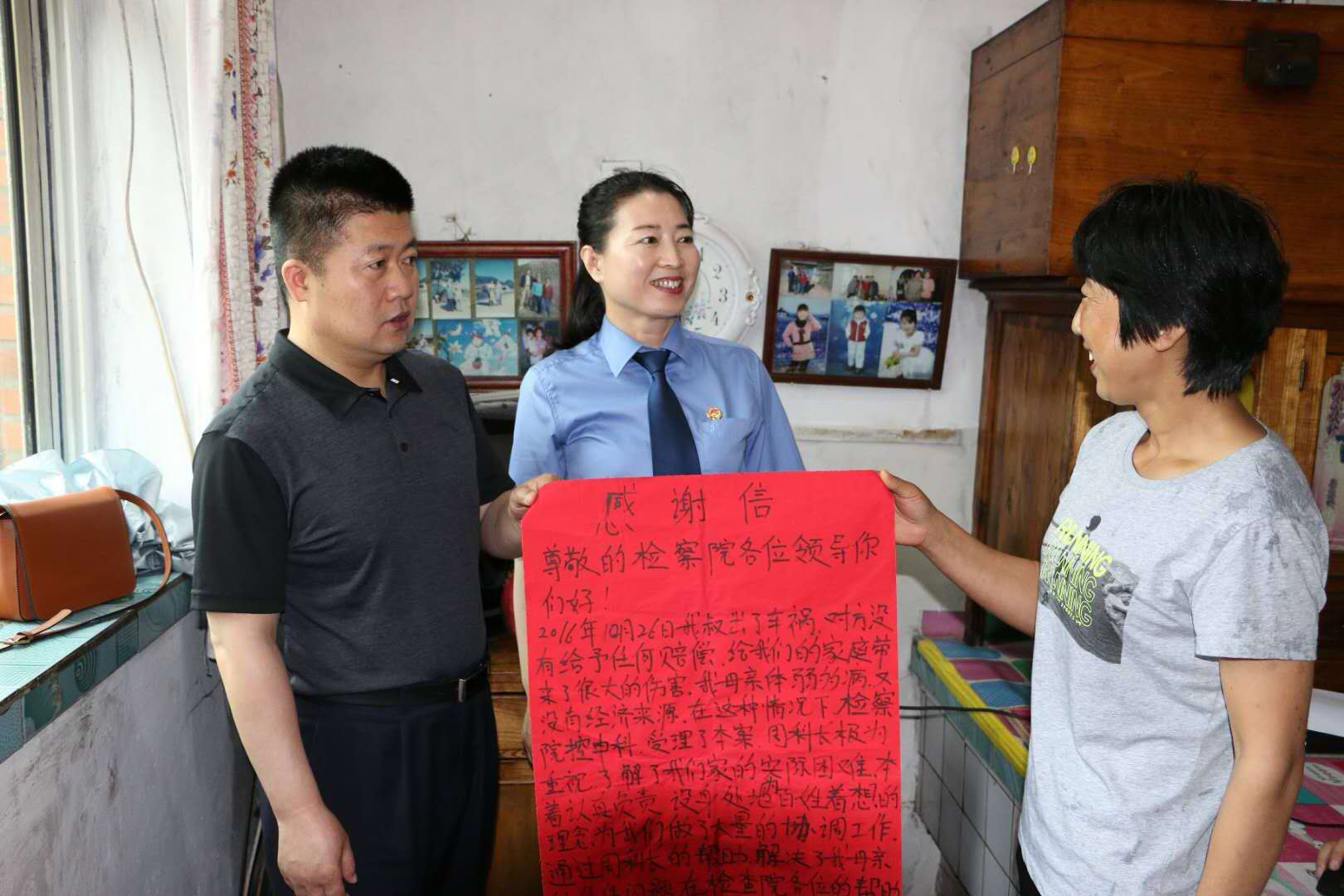 在案件回访过程中,检察官们了解到申诉人李淑云因突发脑梗住院,后又检查出甲状腺肿瘤,急需医疗费,本来拮据的生活再次陷入困境。凤城市检察院结合“深入推进国家司法救助”专项活动,充分发挥多元化救助机制的作用,多方努力协调,为申诉人办理低保事宜,保证了申诉人的基本生活。多次向政法委汇报李淑云急需司法救助的具体情况,协调财政部门为李淑云申请到3万元的司法救助款。面对真诚的检察官,李淑云流下感动的泪水,并嘱咐女儿写下感谢信,感谢检察机关执法为民的情怀。