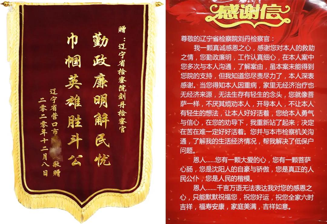 “刘检察官,我不在乎申诉结果了。但你必须收下这些东西,才能了却我一桩心愿,不然不知道自己哪天就死了,不能当面感谢你,我会死不瞑目的……” 2020年12月11日,家住辽宁省营口市西市区的申诉人王某拖着病弱的身体,在家人的陪同下坐车近200公里,带着用棉被包裹的鲜花、感谢信和锦旗出现在球速体育 第一检察部员额检察官刘丹的面前,突然要跪下……