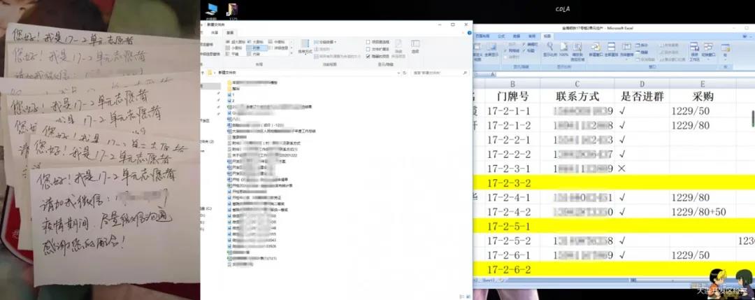 徐爽:“疫情初期,由于工作原因,没有第一时间参与到志愿服务活动中去,看着同事们投入一线,核酸检测、消毒杀菌、站岗守夜……又感动又着急。在同事们加班加点的帮助下,手头工作终于告一段落。夜里十点钟,看见楼长在群里焦急地征集单元长,毫不犹豫地就报了名。第二天,我就‘走马上任’了。虽然小区有业主群,但考虑到很多老年人不会使用智能手机,生怕疏漏一家,我逐户上门核对,把自己的联系方式写在小纸条上。就这样,左手Word右手Excel的日子开始了——帮助核对本单元核酸检测信息,每日统计上报分发业主购物需求,清运生活垃圾,应对居民的随时提问,还有单位的工作也不能落下……时间被切割成了无数碎片,Word一开,往往一天都写不上几行字,也着急也焦躁。但是想到我的朋友们、同事们,他们在冰天雪地里坚持站岗,他们在夜深人静时还在统计,他们吃住在单位已经多日没见到爱人孩子,很多人带病坚持,有的甚至已经病倒在岗位上……我没有理由说辛苦。这个寒冬,我们都是‘最可爱的人’!”