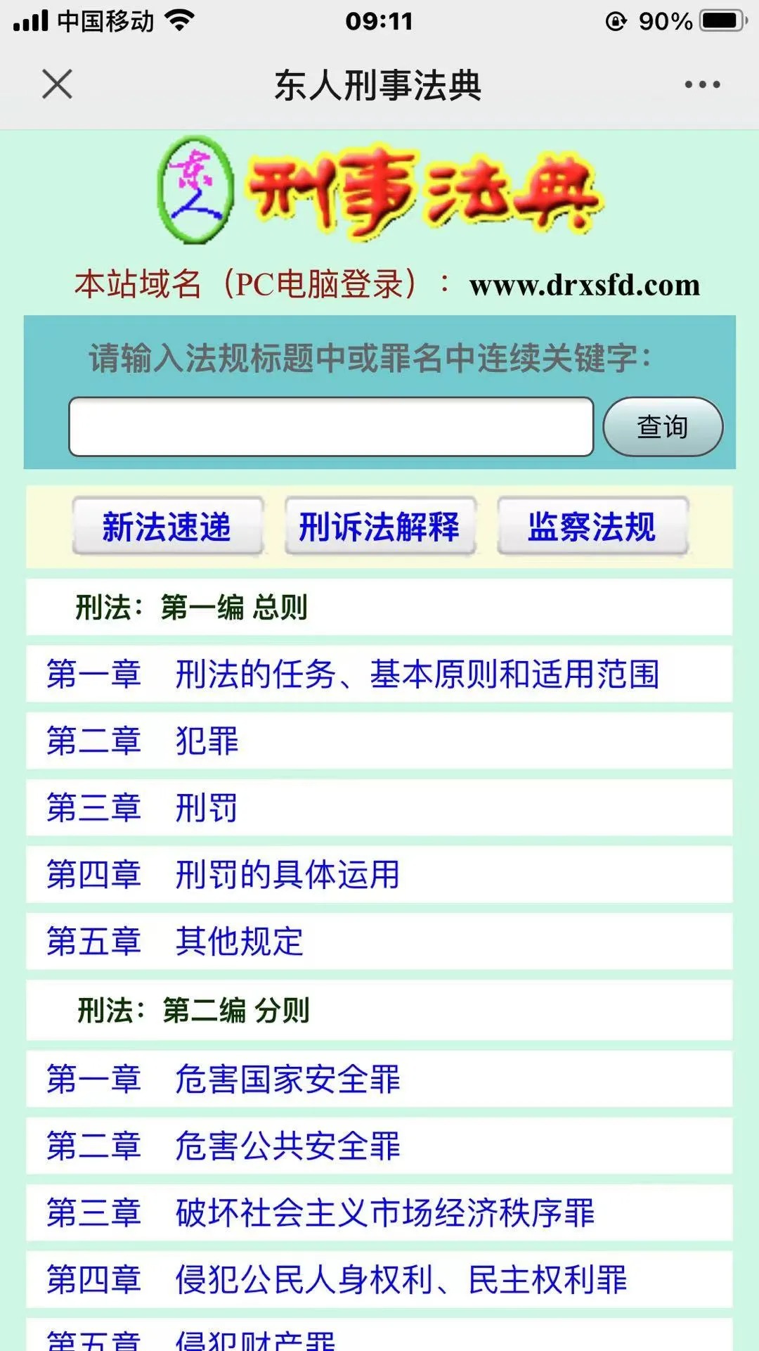 2、目录渐进法:主要用于罪名查询。在电脑版主页或手机版“刑事法典”页面,点击一罪名所属的章节目录,找到并点击该罪名,之后与“搜索法”相同。