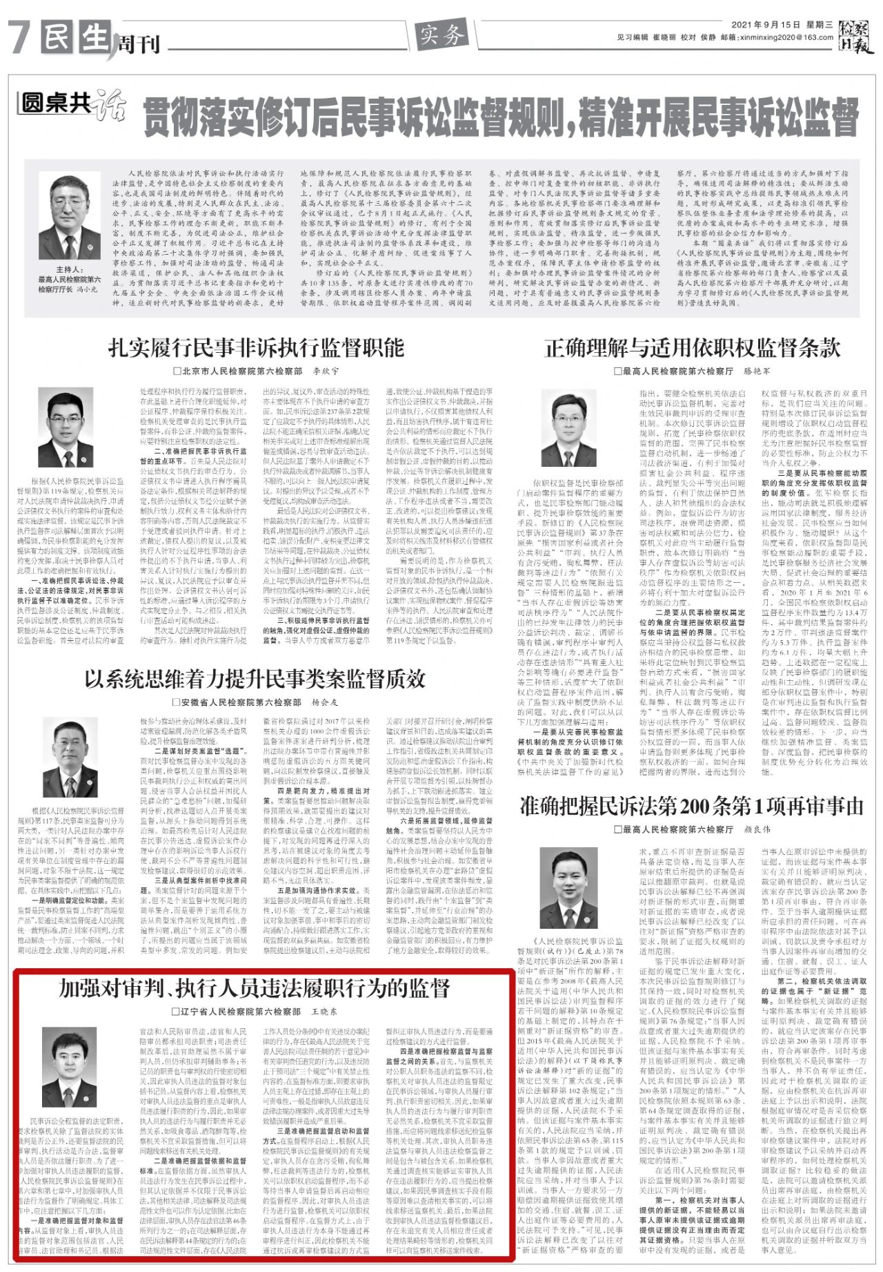 2021年9月15日,《检察日报》七版民生周刊刊登“加强对审判、执行人员违法履职行为的监督”一文,内容如下: