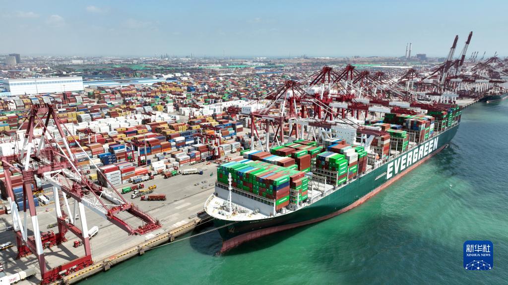 山东港口青岛港前湾港区,集装箱货轮在码头装卸集装箱(2022年6月15日摄,无人机照片)。新华社记者 李紫 恒摄