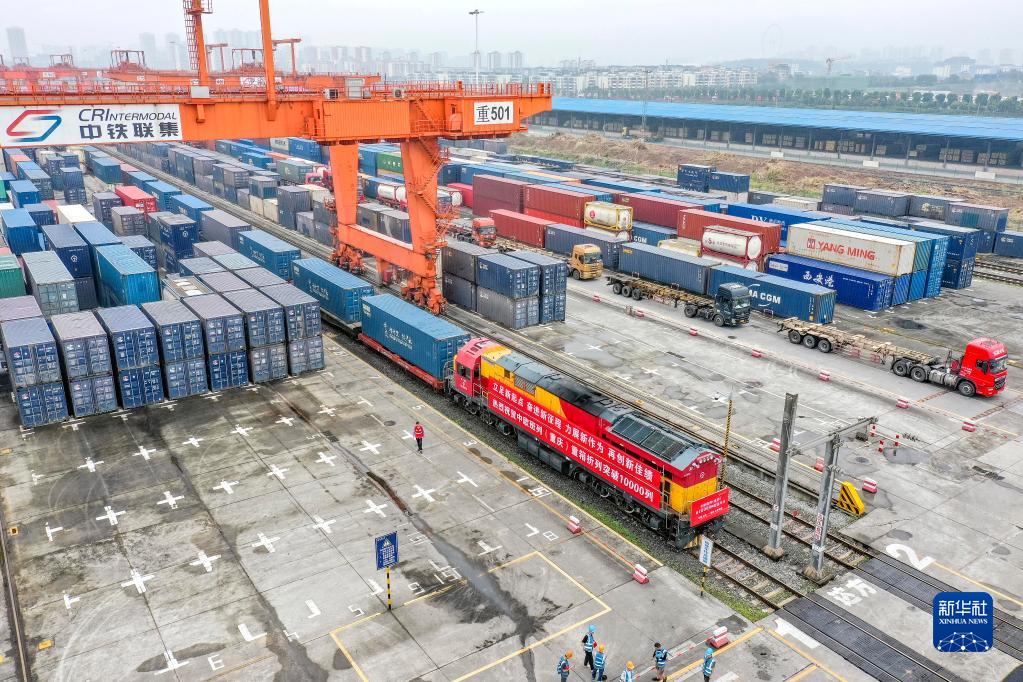 中欧班列(重庆)第10000列列车在重庆团结村中心站等待发车(2022年6月23日摄,无人机照片)。新华社记者 黄伟 摄
