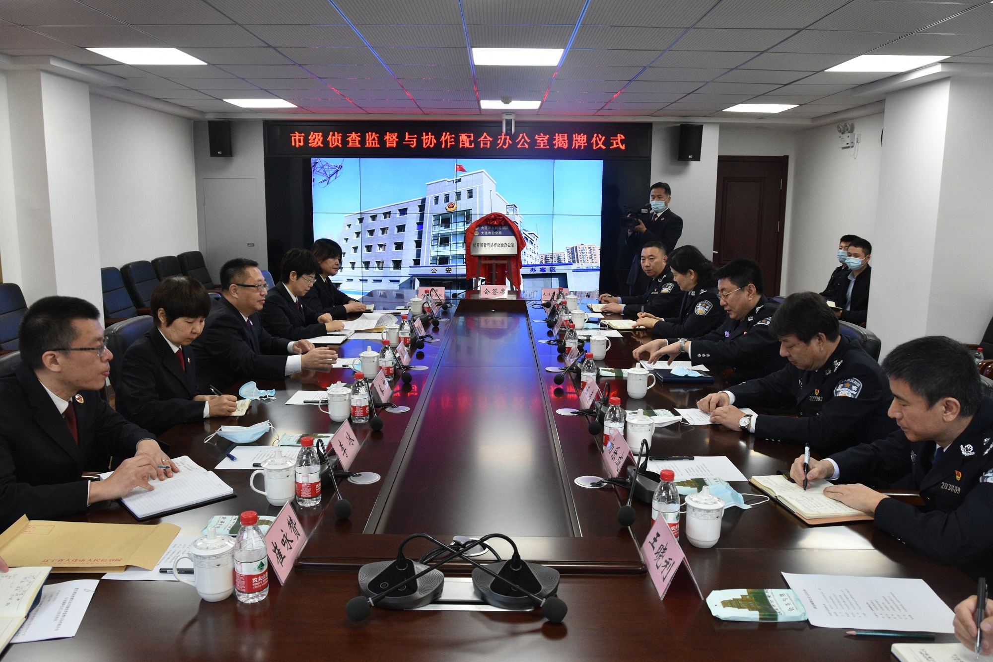 仪式上,双方会签了《关于设立市级侦查监督与协作配合办公室的决定》《关于侦查监督与协作配合办公室依法开展工作的指导意见(试行)》,明确了机构设置、职责定位、权限分工等事项。大连市副市长、市公安局局长张振铎,市检察院检察长周焱出席揭牌仪式并致辞。