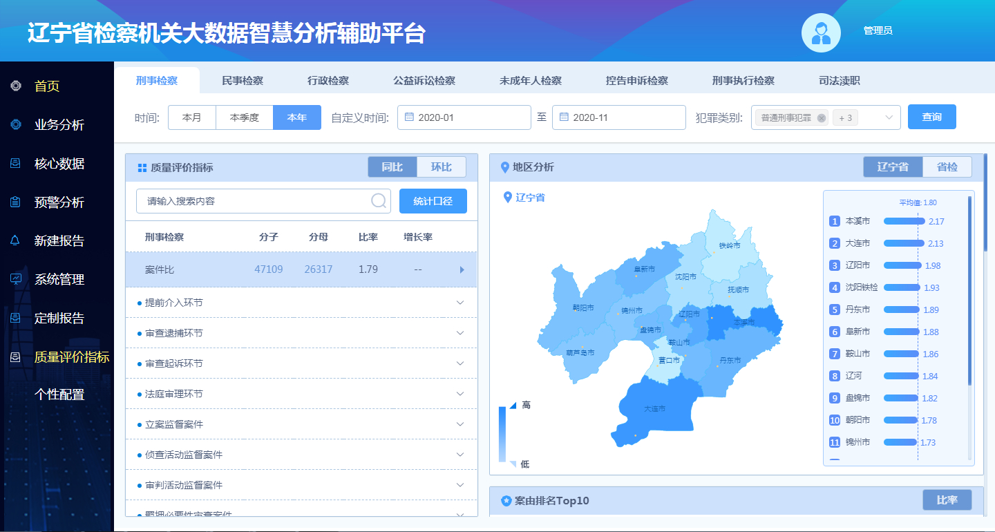 该系统包含业务态势分析、核心业务数据指标多维度展示、业务指标预警分析、业务分析报告制作、案件质量主要评价指标(87项)下钻到案、到人等功能,是服务于检察机关决策人员的数据分析平台,在对检察机关各条线业务数据集中整合处理、建模融合的基础上,通过统计分析、数据挖掘、数据分析等技术将检察机关各项工作进行全方位、立体化、可视化、实时化的深入分析和展示,为检察机关各级决策人员掌握检察工作现状及历史情况、发现问题及瓶颈、提供对策及解决方案、为切实改进检察工作提供有力抓手。