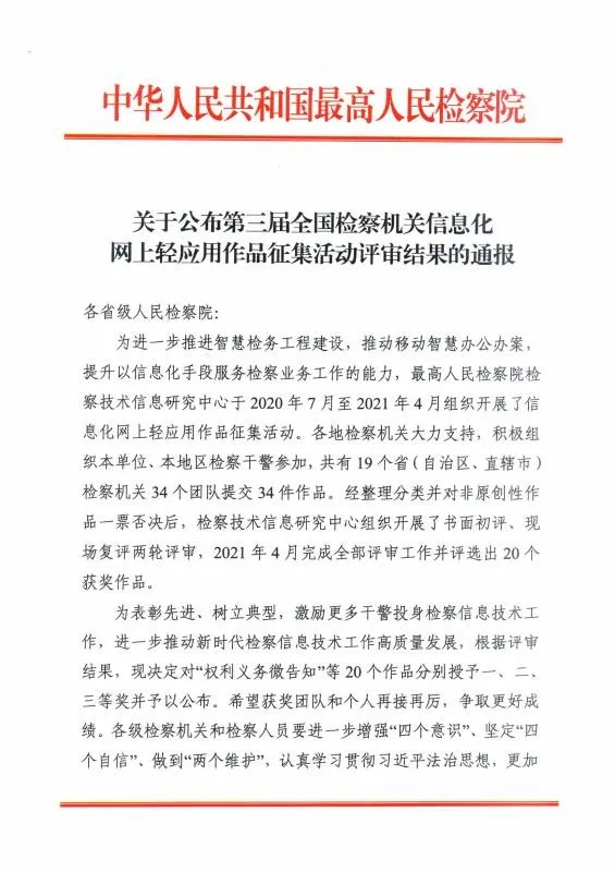 为进一步推进智慧检务工程建设,推动移动智慧办公办案,提升以信息化手段服务检察业务工作的能力,最高人民检察院检察技术信息研究中心于2020年7月至2021年4月组织开展了信息化网上轻应用作品征集活动。此次活动围绕检察信息化应用开展,依托检察机关政务微信平台进行。